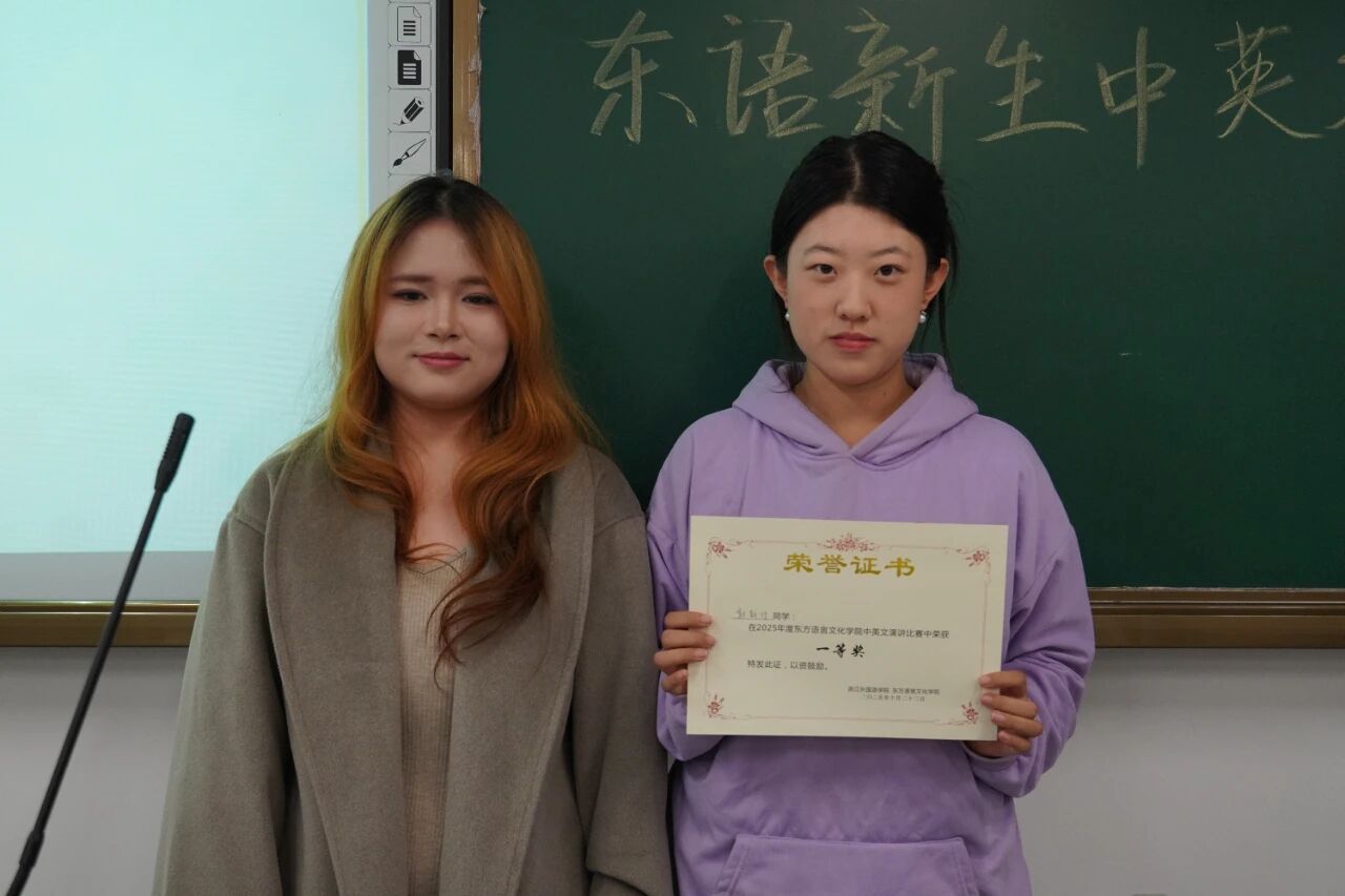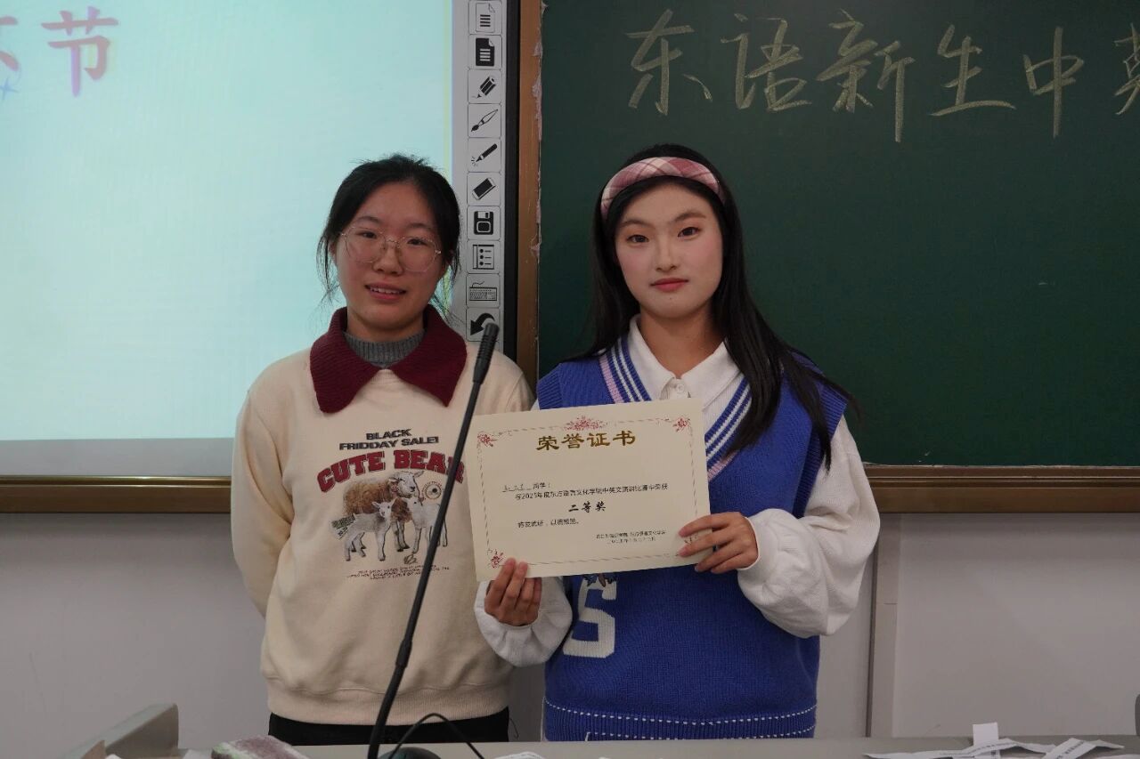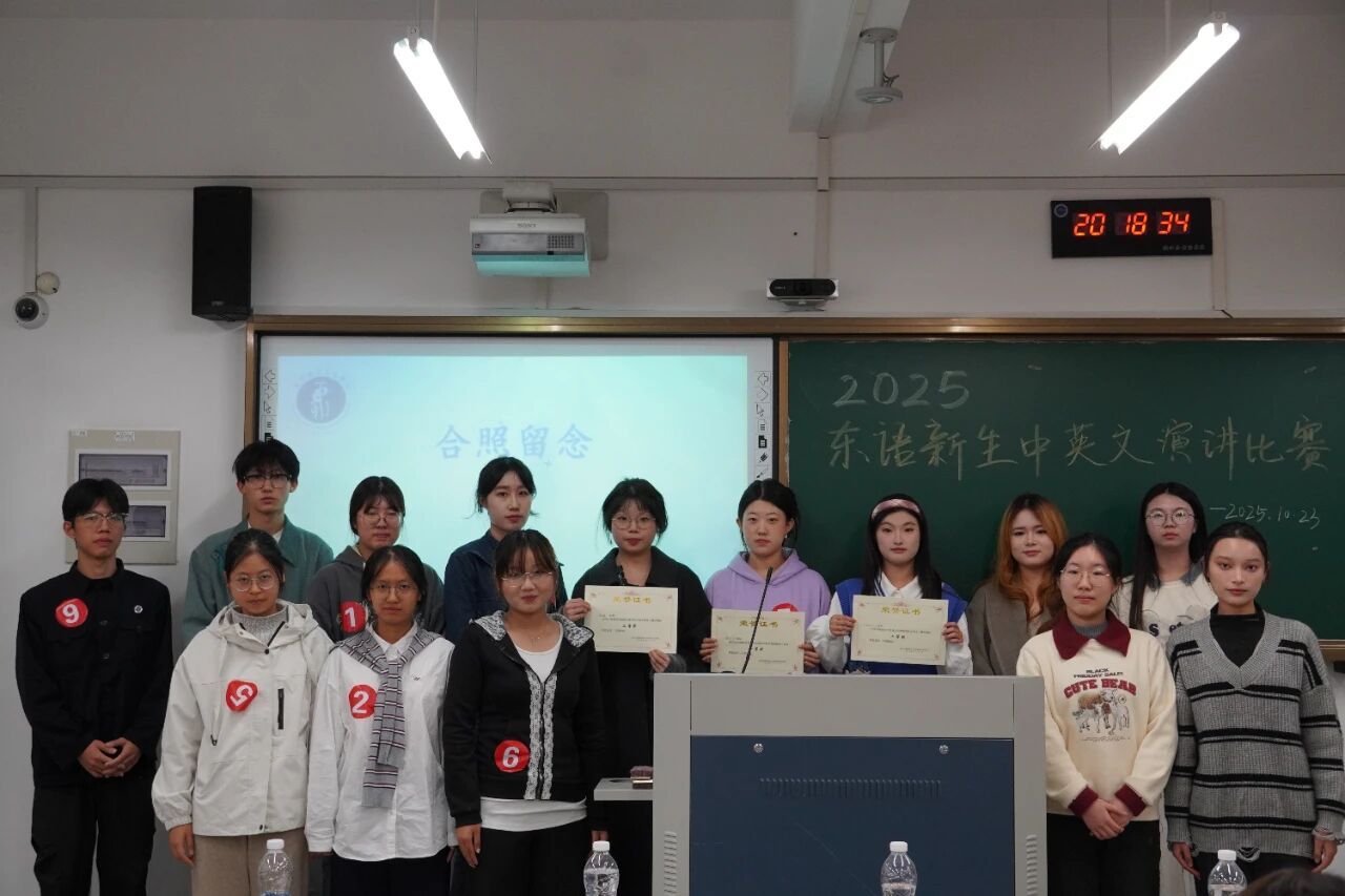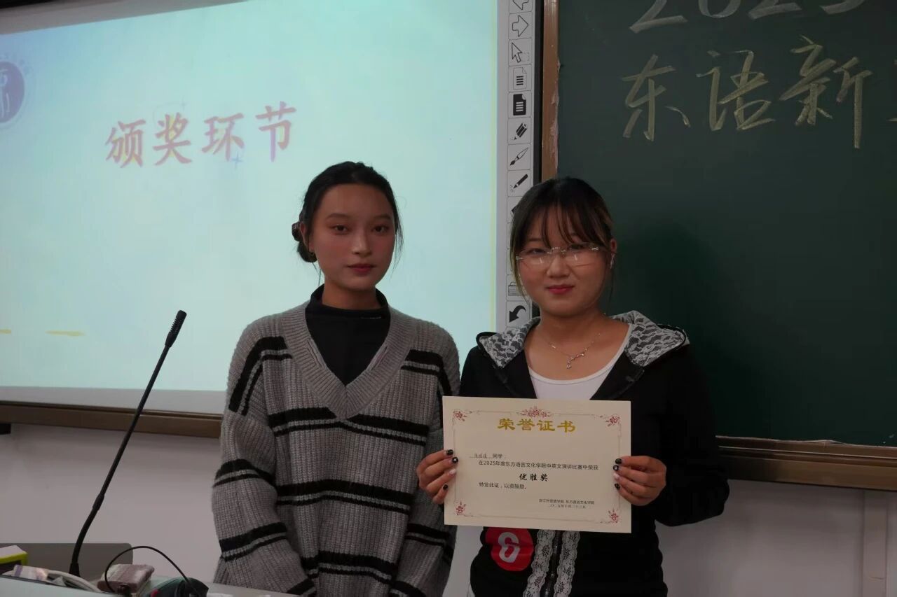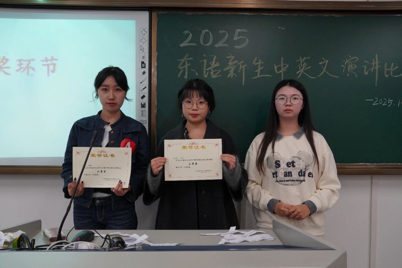 随着即兴演讲环节的结束,本届比赛也步入尾声。经评委们客观公正的综合评定,获奖结果最终揭晓:25阿语1班郭新竹荣获一等奖;25阿语1班赵芯艺获二等奖;25日语3班王舒涵、25阿语2班余雨萌获三等奖;25韩语2班侯媛媛获得优胜奖。