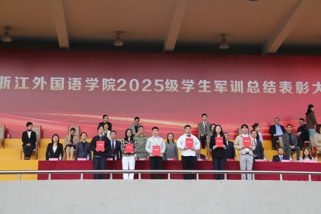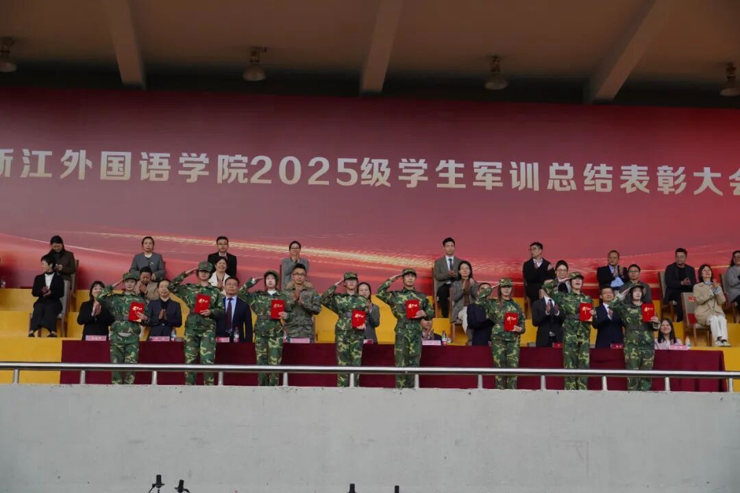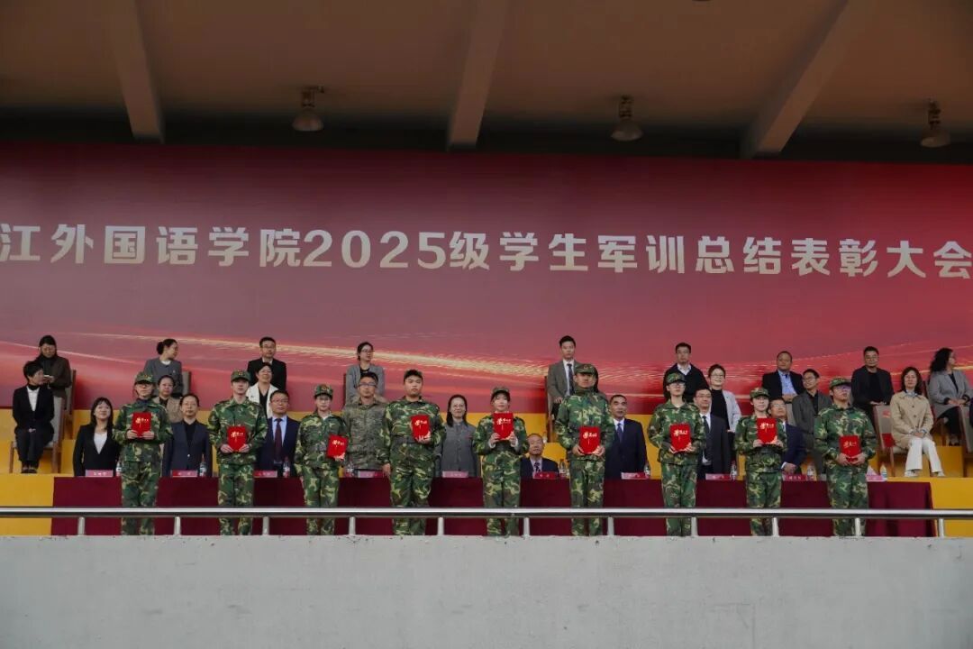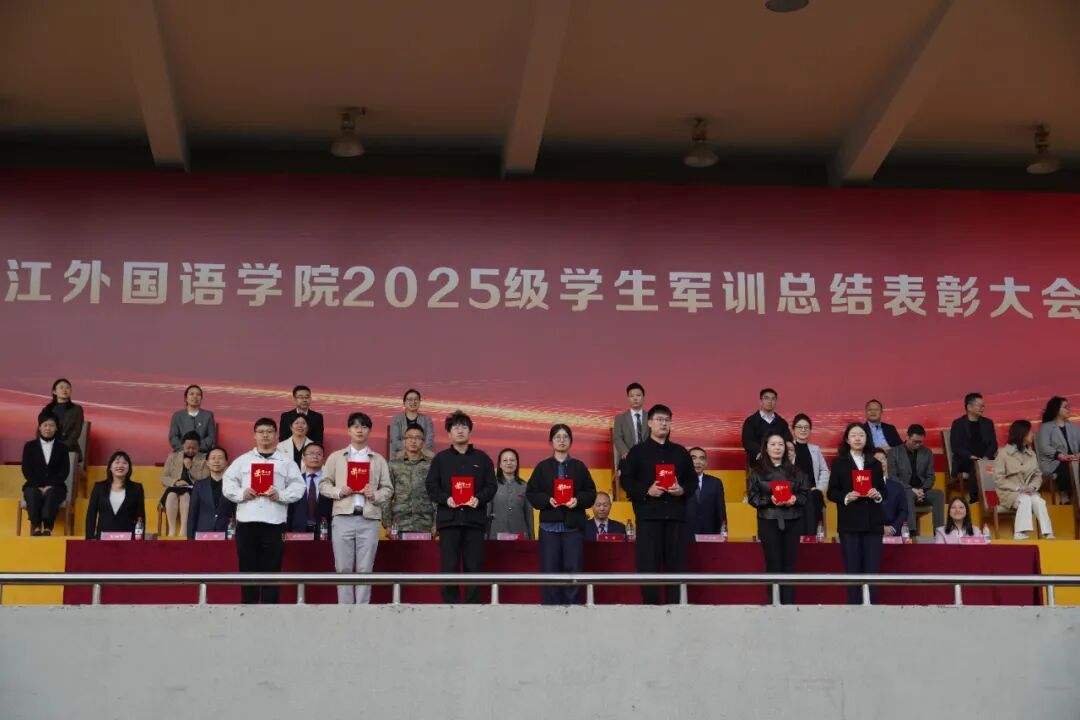 在激动人心的颁奖环节,我院所在的二营凭借出色的整体表现和严格的作风纪律,荣获“优秀方阵”“队列会操优胜连”称号。同时,多名同学荣获“军训先进个人”荣誉。当获奖代表从领导手中接过沉甸甸的证书时,全场报以最热烈的掌声。这份荣誉,属于每一位在骄阳下坚持的东语学子,是对他们拼搏与成长的最佳褒奖。