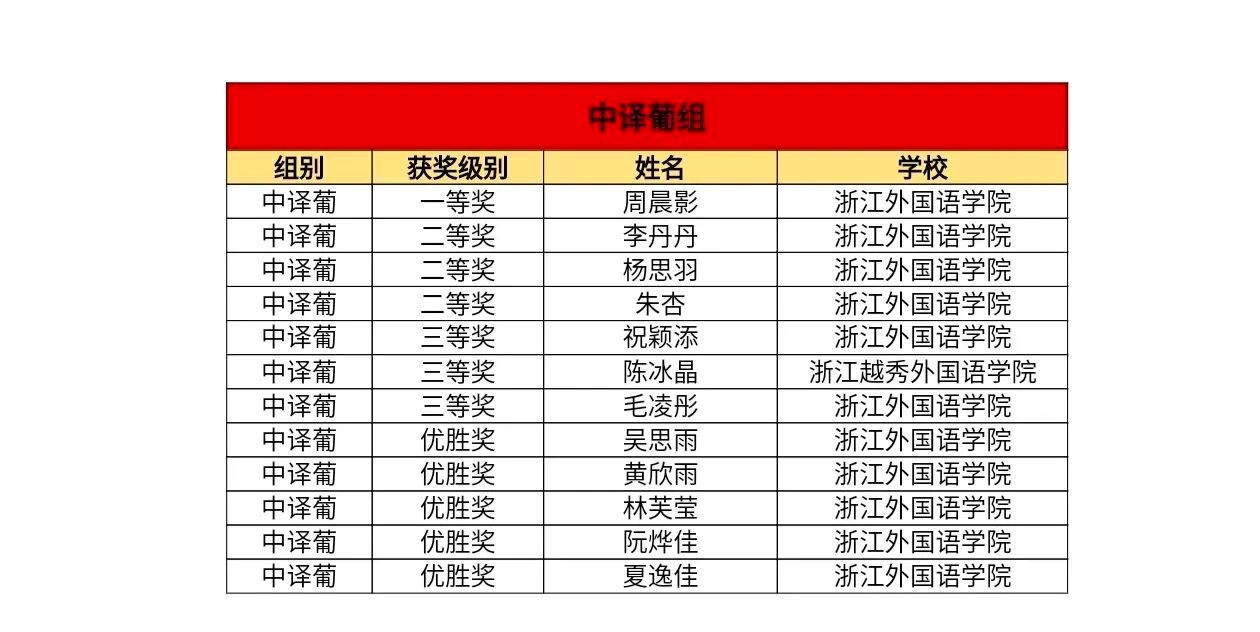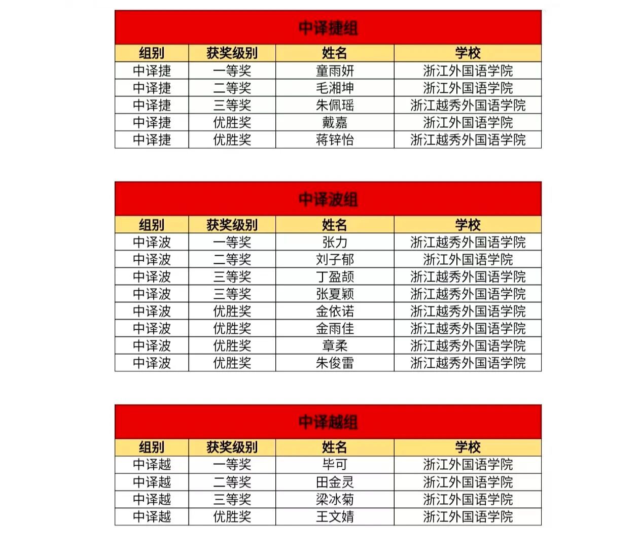 大赛自5月启动以来,得到了省内高校外语类院系的广泛关注与积极参与。大赛设立中译日、中译阿、中译朝、中译土、中译俄、中译德、中译西、中译法、中译意、中译葡、中译捷、中译波、中译越13个本科组别,共有来自13所高校的412余名在校本科生报名参加。经过专家评审,共评出特等奖3名、一等奖18名、二等奖44名、三等奖62名、优胜奖86名。各组别获奖名单如下: