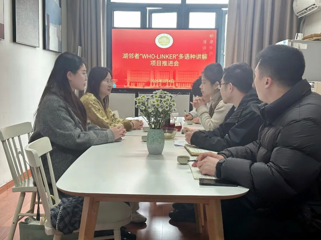 3月4日,我院召开“湖邻者WHO-LINKER”多语种讲解项目推进会,旨在进一步推进项目建设,深化校地合作育人机制。杭州西湖风景名胜区综合事务保障中心接待交流科丁露赟、戴晨露,校团委书记陈超,我院党委书记毕莹、党委副书记宋洋及辅导员苏宣丞、高卓等出席会议。