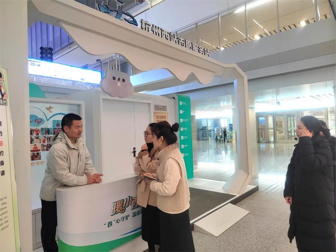 座谈结束后,我校一行还参观了位于杭州西站枢纽内的“在西站”党群服务中心、规划展示馆等场馆,实地考察了杭州西站志愿服务站,并了解其运行模式。